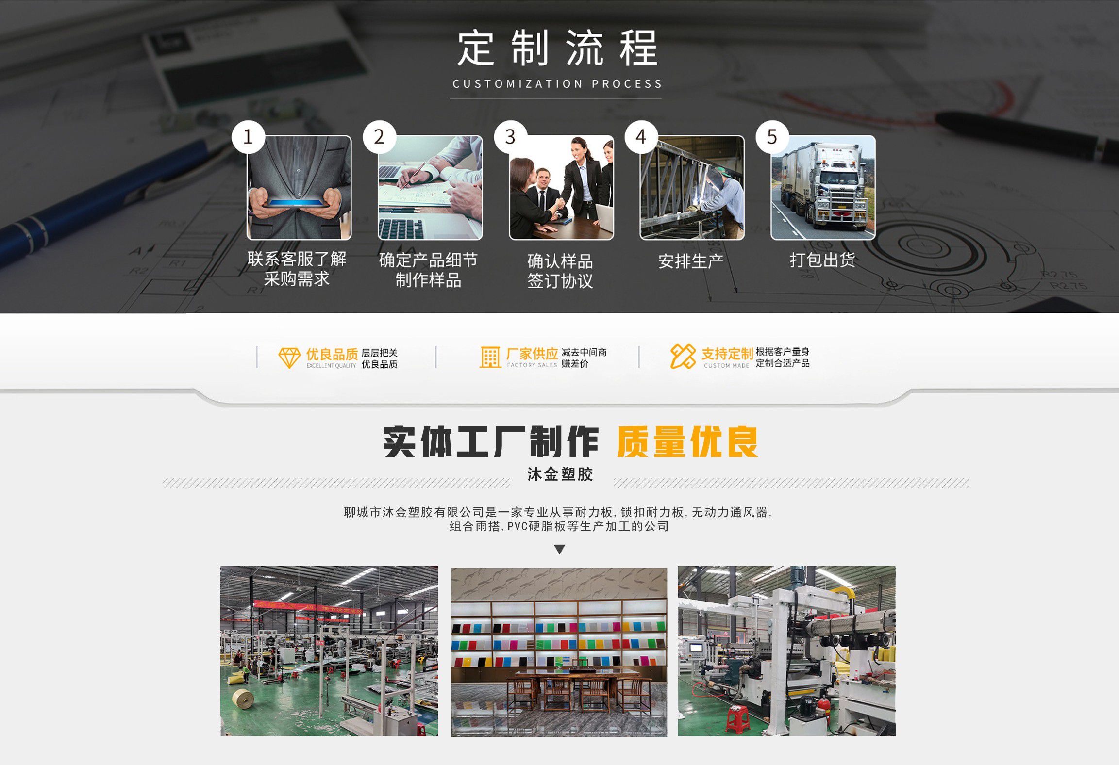 聊城市沐金塑膠有限公司注冊(cè)資金2180萬元,占地20000余平方,擁有自建廠房15000平方,員工100余名。10余年來,公司主營(yíng)耐力板,鎖扣耐力板,耐力板深加工,無動(dòng)力通風(fēng)器,組合雨搭,PVC硬脂板,耐力板廠家等板材的發(fā)展戰(zhàn)略,逐漸成長(zhǎng)為綜合性企業(yè)。 公司擁有多條板材共擠生產(chǎn)線,采用世界知名品牌進(jìn)口原材料和先進(jìn)工藝,依據(jù)完善的ISO9001質(zhì)量管理體系和ISO14001環(huán)境管理體系,為產(chǎn)品的卓越品質(zhì)提供了強(qiáng)有力的保證。憑借過硬的創(chuàng)新能力和堅(jiān)實(shí)的硬件基礎(chǔ),贏創(chuàng)已成為國(guó)內(nèi)領(lǐng)先的熱塑性板材生產(chǎn)商,產(chǎn)品被廣泛應(yīng)用于建筑業(yè)、農(nóng)業(yè)、工業(yè)、廣告業(yè)、安防行業(yè)及DIY領(lǐng)域。 公司始終致力于通過提供最優(yōu)的板材應(yīng)用解決方案,為客戶創(chuàng)造最高的價(jià)值;堅(jiān)守創(chuàng)新、質(zhì)量、靈活、服務(wù)和速度的核心價(jià)值觀;堅(jiān)持“完美的產(chǎn)品需要完美服務(wù)的支持”的經(jīng)營(yíng)理念,努力實(shí)現(xiàn)成為世界領(lǐng)先的板材與解決方案供應(yīng)商的夢(mèng)想。 在未來,公司將立足客戶需求,不斷改變和完善現(xiàn)有產(chǎn)品,拓展產(chǎn)品線和充分開發(fā)板材的應(yīng)用領(lǐng)域,為客戶創(chuàng)造全方位的價(jià)值。同時(shí)更好地實(shí)現(xiàn)員工的價(jià)值,實(shí)現(xiàn)公司團(tuán)隊(duì)的價(jià)值。我們將與您一起創(chuàng)贏未來! 企業(yè)使命:成為世界領(lǐng)先的板材與解決方案供應(yīng)商。 公司愿景:通過提供最優(yōu)的板材應(yīng)用解決方案,為客戶創(chuàng)造最高的價(jià)值。 核心價(jià)值觀:質(zhì)量...